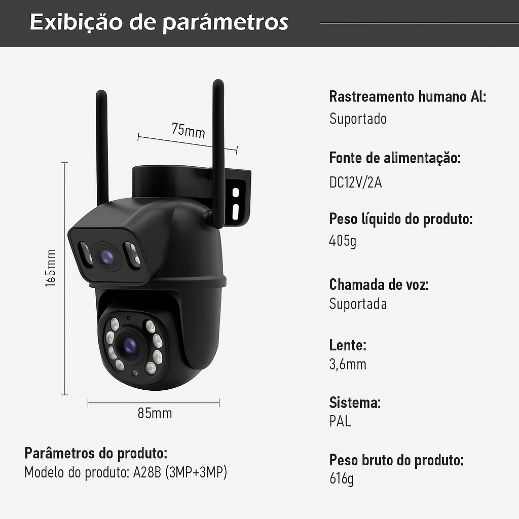 - Resolução: 3MP + 3MP (Imagem 4K combinada)