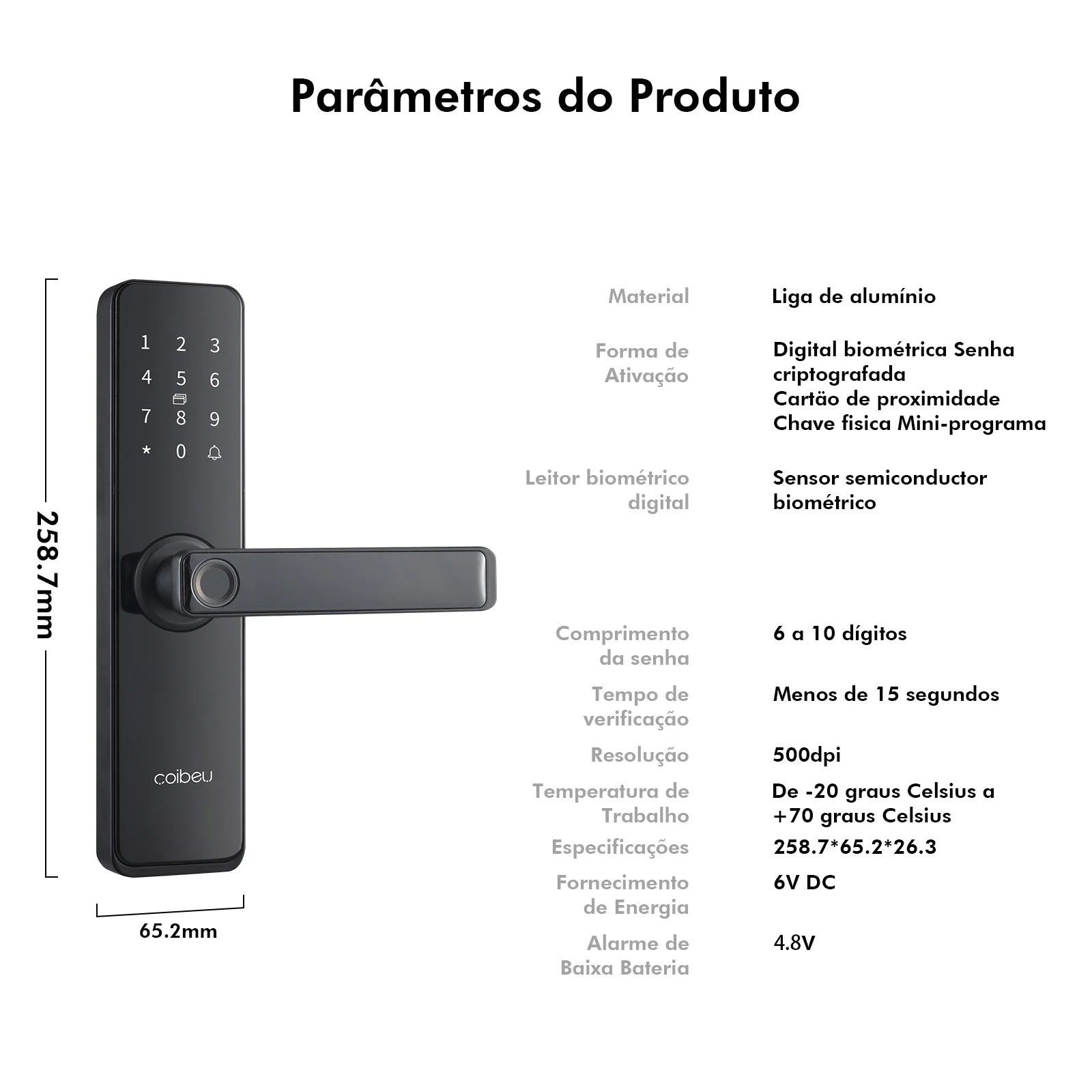 - 6 formas de acesso: Biometria, senha PIN, cartão magnético, app Tuya, chave física e senha temporária
